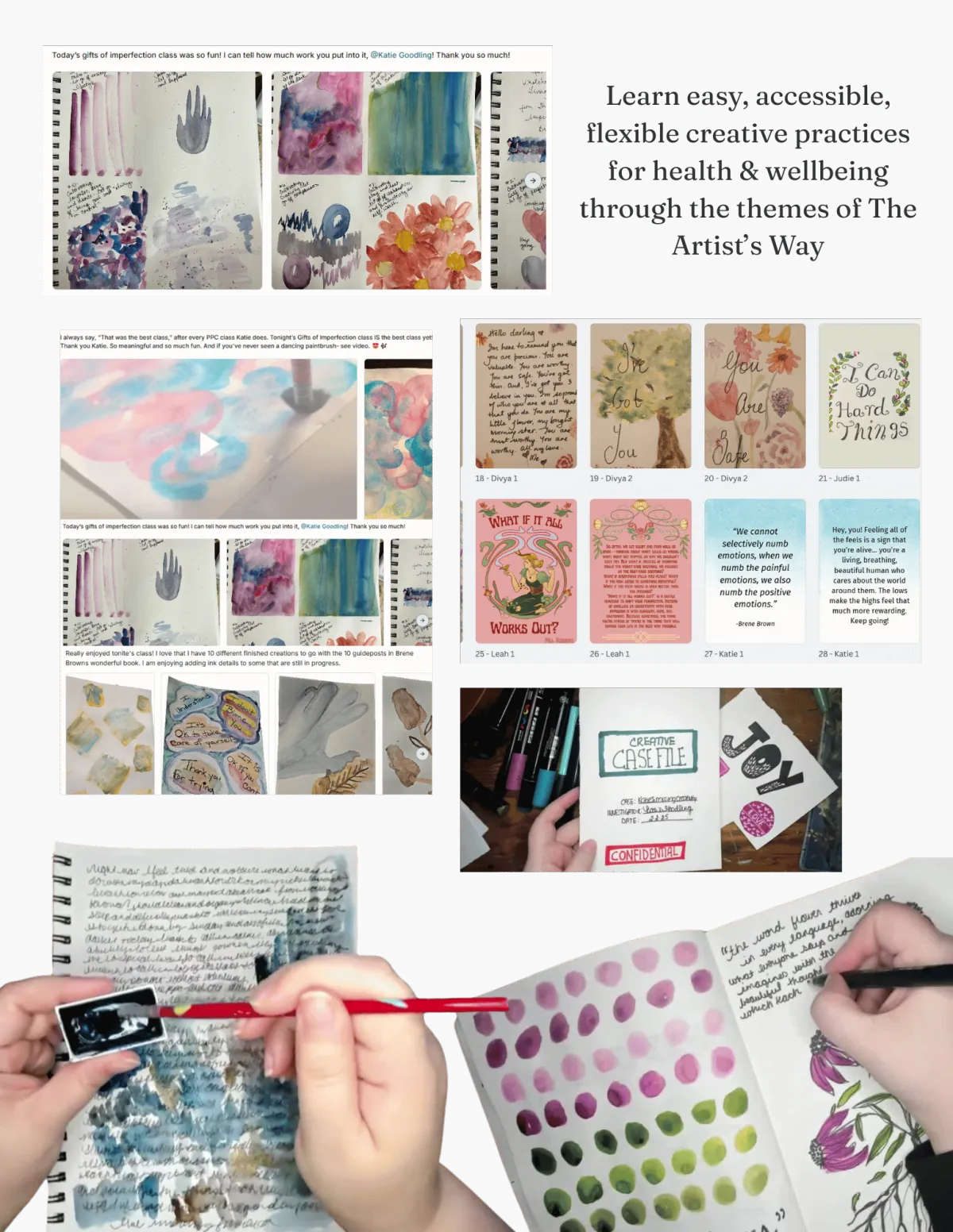 X This will not cure your illness, resolve your grief, or undo the burnout. What it can do is give you a creative wellness practice that benefits your health and wellbeing, a real connected community, and a clearer sense of who you are in this season of your life.